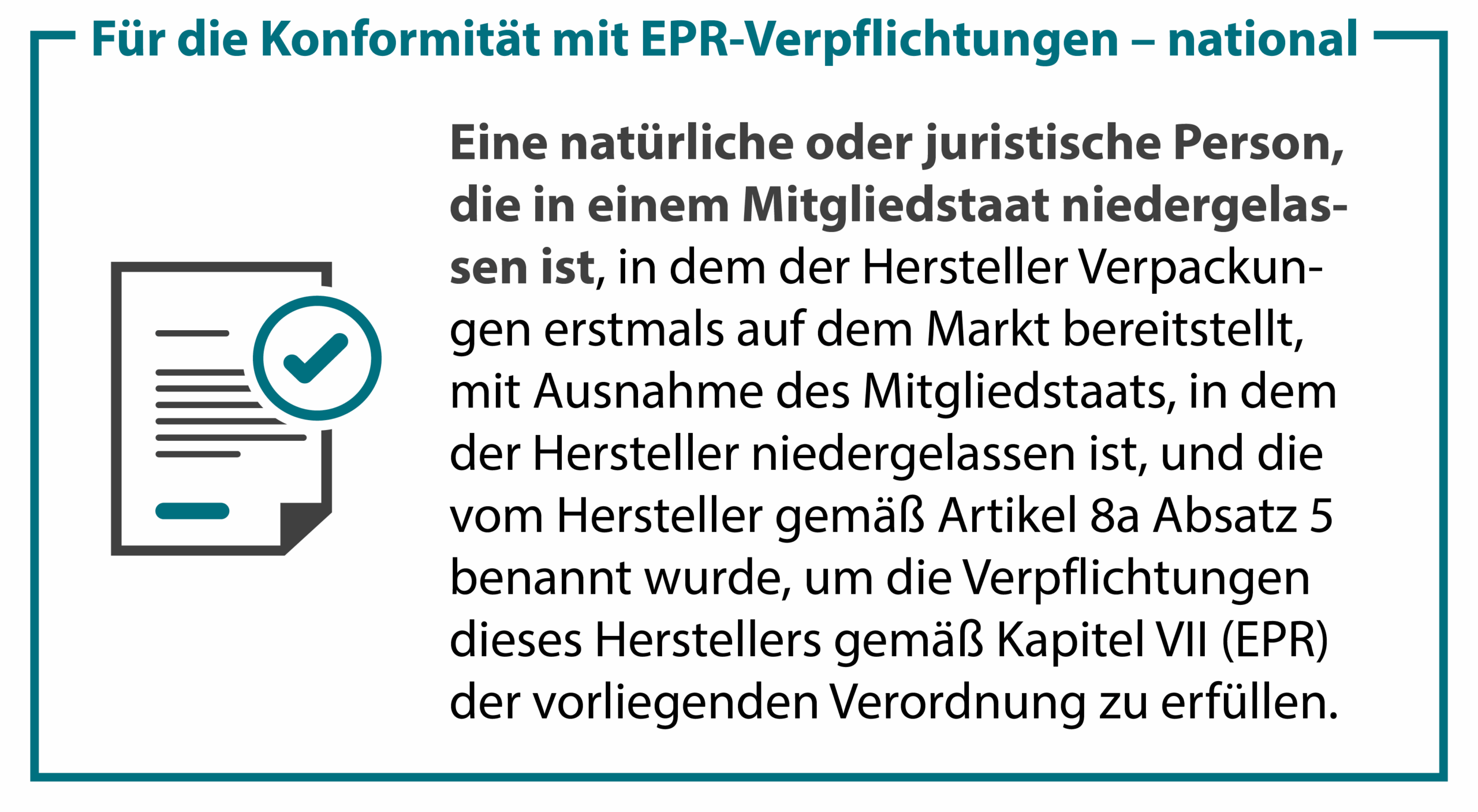 Erzeuger können EU-weit einen Bevollmächtigten ernennen, der spezifische Aufgaben im Zusammenhang mit den Erzeugerpflichten übernimmt (insbesondere in Bezug auf die Konformität der Verpackungen mit Nachhaltigkeit- und Kennzeichnungsanforderungen in PPWR). Der Bevollmächtigte fungiert dann als Ansprechspartner für die zuständigen nationalen Behörden. - Bevollmächtigter für Hersteller (EPR)