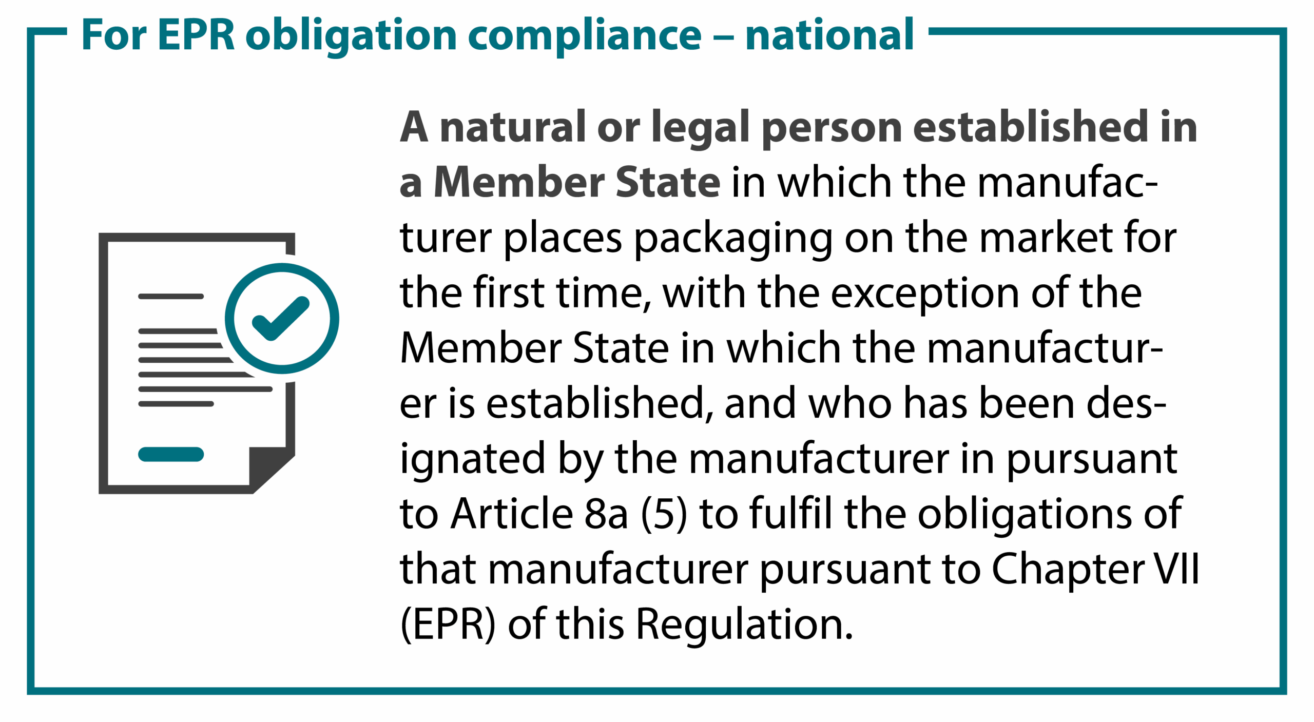 Manufacturers may appoint an EU-wide Authorised Representative to perform specifics tasks related to manufacturers’ obligations (related to packaging conformity with the sustainability and labelling requirements in PPWR). The Authorised Representative acts then as single point of contact for the competent national authorities. - Authorised representative for producer (EPR)