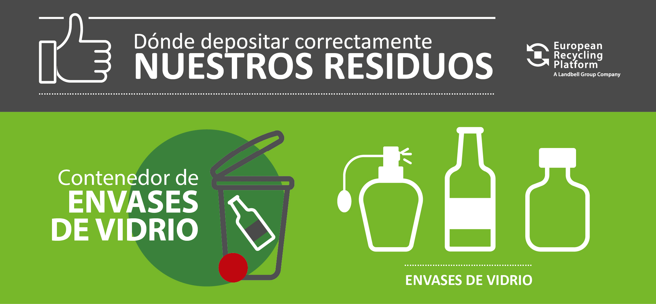 The green container is exclusively for glass waste, without lids or caps.